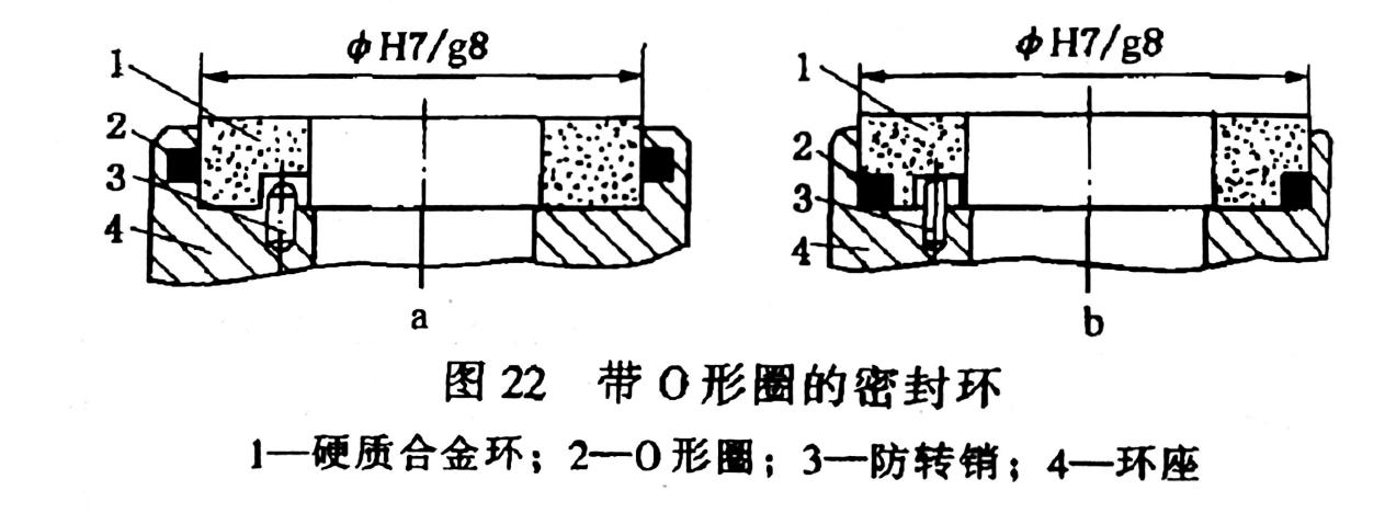 這種組合式密封環(huán)在硬質(zhì)合金環(huán)與環(huán)座之間用H7/g8的滑動配合。在兩者配合的圓柱面間放置一聚四氟乙烯或合成橡膠制成的O形密封圈,避免其間的密封流體泄露,并且將硬質(zhì)合金環(huán)與環(huán)座結(jié)合在一起。在硬質(zhì)合金環(huán)與環(huán)座的平面結(jié)合處設(shè)一銷釘,以傳遞扭矩。此種組合結(jié)構(gòu),沒有組合應(yīng)力產(chǎn)生,也無由此引起的組合密封環(huán)的密封端面的變形,可是組合密封環(huán)零件的數(shù)量增加了,還需要在硬質(zhì)合金環(huán)上鉆孔或槽,給制造提高了難度,另外由于增設(shè)了O形圈,密封環(huán)的使用溫度受到了限制。