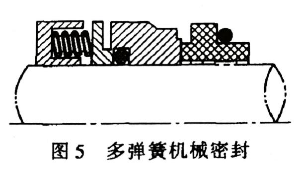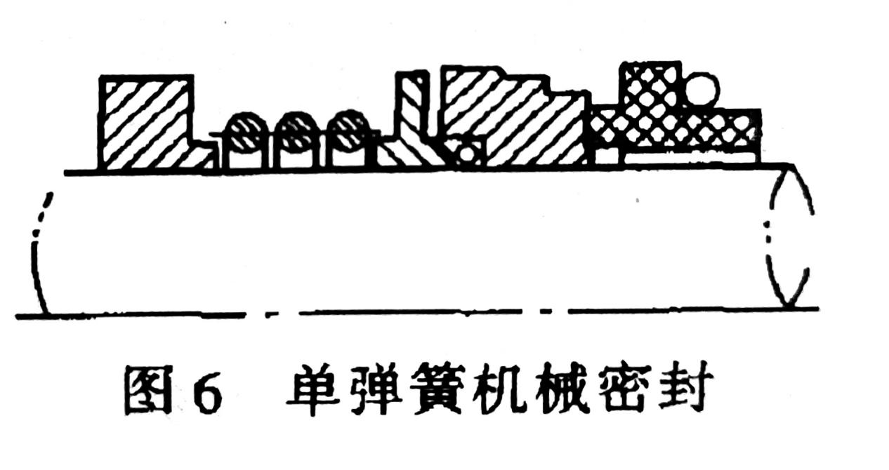 按補(bǔ)償結(jié)構(gòu)中彈簧的數(shù)量可分為多彈簧和單彈簧機(jī)械密封。補(bǔ)償結(jié)構(gòu)中有多個(gè)彈簧的密封稱(chēng)為多彈簧機(jī)械密封(圖5);補(bǔ)償結(jié)構(gòu)中只有一個(gè)彈簧的機(jī)械密封稱(chēng)為單彈簧機(jī)械密封(圖6)。多彈簧機(jī)械密封又稱(chēng)小彈簧機(jī)械密封,這種結(jié)構(gòu)軸向長(zhǎng)度較小,可用更改彈簧數(shù)量的辦法調(diào)節(jié)彈性力大小,軸向力較均勻,適用于高速機(jī)械密封,在腐蝕性介質(zhì)中不宜采用。單彈簧機(jī)械密封又稱(chēng)大彈簧機(jī)械密封,密封結(jié)構(gòu)較為簡(jiǎn)單。有的密封型式還用彈簧傳遞扭矩。國(guó)產(chǎn)密封應(yīng)用大彈簧較多,但不能用于高速。