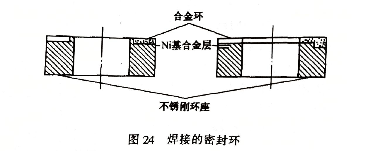 為改善熱裝式密封環(huán)松脫的問題,呈現(xiàn)了焊接的密封環(huán)(圖24)。所用的硬質(zhì)合金是以Cr3C2為硬質(zhì)相、Ni為粘結(jié)相的燒結(jié)合金材料。耐腐蝕優(yōu)于YG6等硬質(zhì)合金,高溫下具有優(yōu)異的抗氧化性能,在1000℃空氣中加熱2小時(shí)無任何變化。可是導(dǎo)熱性能較差,僅為YG6的1/3;線膨脹系數(shù)大,比YG6大1倍多,為10.2x10-6/℃(10~500℃時(shí))。這兩點(diǎn)導(dǎo)致了耐熱沖擊性能不如YG6好。正因?yàn)榫€膨脹系數(shù)較大,和馬氏體不銹鋼接近(10~500℃時(shí)為11x10-6/℃),為和環(huán)座焊接提供了有利條件。焊接時(shí)需在環(huán)和座之間鋪放一層鎳基粉末,置于真空電阻爐中,經(jīng)1100℃高溫熔焊,然后進(jìn)行回火處理,以消除焊接應(yīng)力。由于是焊接的密封環(huán),硬質(zhì)合金環(huán)的厚度可以比YG6薄,毛坯的厚度也只要3~3.5mm。又因密度小,是YG6的一半(7~7.5g/cm3),因此,可節(jié)約貴重金屬,價(jià)格較低。這種合金的牌號(hào)為CN15,其間Cr3C2 85%、Ni 15%,由北京硬質(zhì)合金廠研制成功。