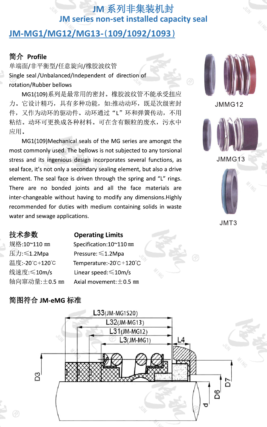 單端面/非平衡型/任意旋向/橡膠波紋管。 MG1(109)系列是最常用的密封。橡膠波紋管不能承受扭應力。它設計精巧,具有多種功能,如:推動動環(huán),既是次級密封件,又作為動環(huán)的驅動件。動環(huán)通過“L”環(huán)和彈簧傳動,不用粘結。動環(huán)可更換成各種材料。可在含有顆粒的廢水,污水中應用。