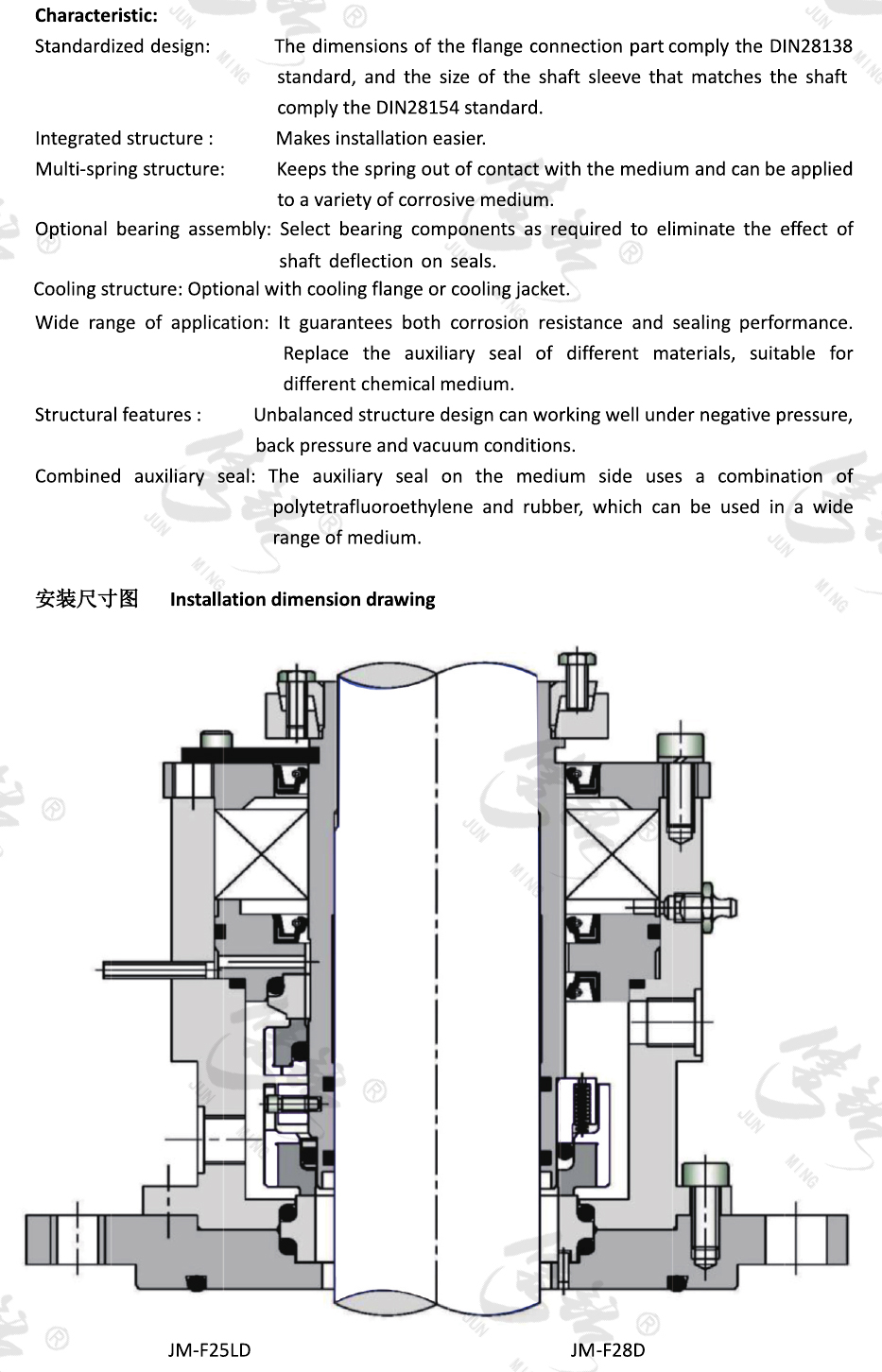 JM-F28系列密封為適用于頂部驅(qū)動(dòng)攪拌器的集裝式密封。集成式結(jié)構(gòu),安裝簡(jiǎn)單便捷。集裝密封法蘭連接部分的尺寸符合DIN28138標(biāo)準(zhǔn),多彈簧結(jié)構(gòu),包裝端面載荷均勻,軸向補(bǔ)償性能好。該系列密封分為四種結(jié)構(gòu)形式: JM-F28(單端面無(wú)軸承)、JM-F28L (單端面附軸承)、JM-F28D (雙端面無(wú)軸承)、JM-F28LD (雙端面附軸承) 。適用于大多標(biāo)準(zhǔn)連接尺寸
