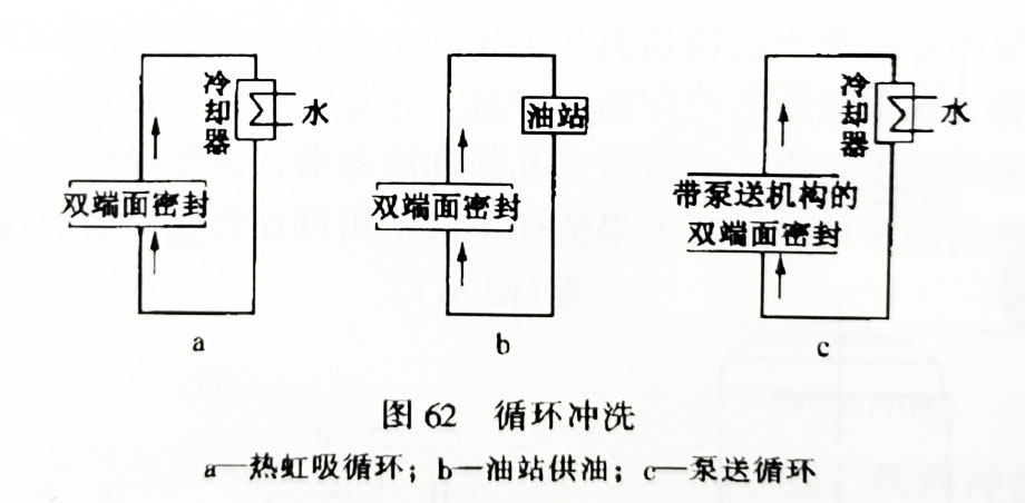 循環(huán)沖洗是經(jīng)過一個泵送裝置使外加的密封流體進(jìn)行循環(huán)(圖62)。這里有兩點需要引起留意,一是“泵送裝置”,可以是外加的油站和密封腔形成閉合回路進(jìn)行循環(huán),也可在密封腔中裝設(shè)一個泵,或者是用熱虹吸的原理使流體循環(huán)。另一點要留意的是“外加的密封流體”。這種沖洗方法用在雙端面或多端面密封上,在單端面密封上不選用。循環(huán)沖洗也有人稱為“外循環(huán)”。