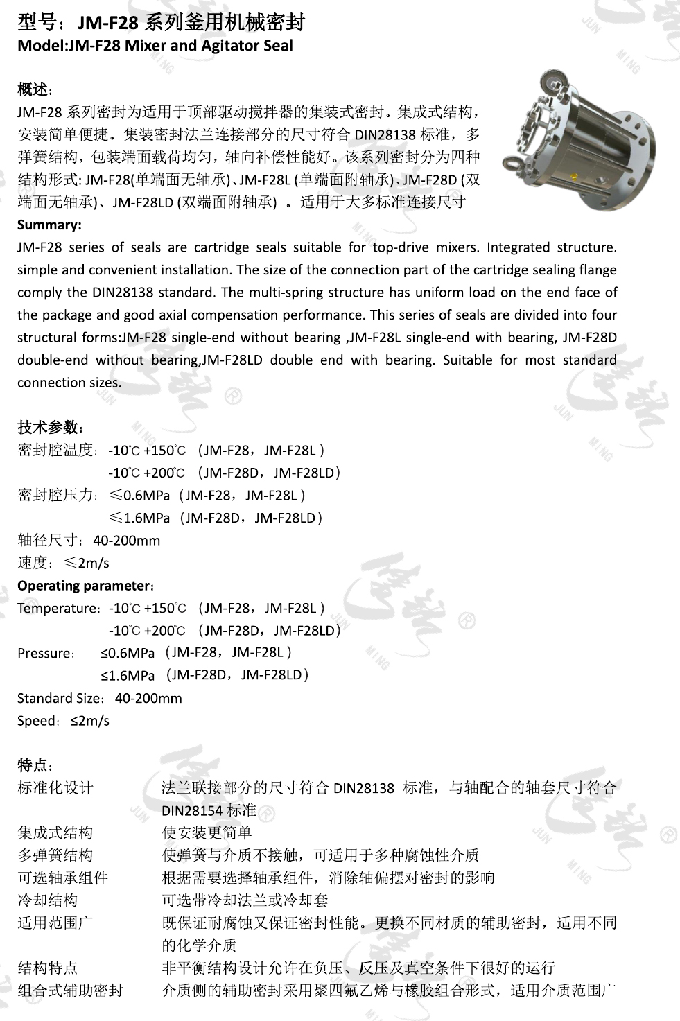 JM-F28系列密封為適用于頂部驅(qū)動(dòng)攪拌器的集裝式密封。集成式結(jié)構(gòu),安裝簡(jiǎn)單便捷。集裝密封法蘭連接部分的尺寸符合DIN28138標(biāo)準(zhǔn),多彈簧結(jié)構(gòu),包裝端面載荷均勻,軸向補(bǔ)償性能好。該系列密封分為四種結(jié)構(gòu)形式: JM-F28(單端面無(wú)軸承)、JM-F28L (單端面附軸承)、JM-F28D (雙端面無(wú)軸承)、JM-F28LD (雙端面附軸承) 。適用于大多標(biāo)準(zhǔn)連接尺寸