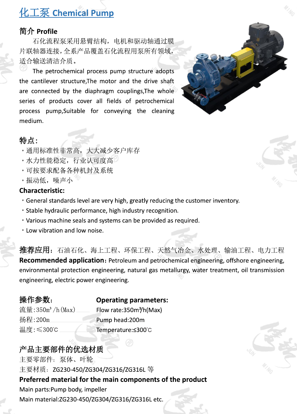 石化流程泵采用懸臂結(jié)構(gòu),電機(jī)和驅(qū)動(dòng)軸通過(guò)膜片聯(lián)軸器連接,全系產(chǎn)品覆蓋石化流程用泵所有領(lǐng)域,適合輸送清潔介質(zhì)。